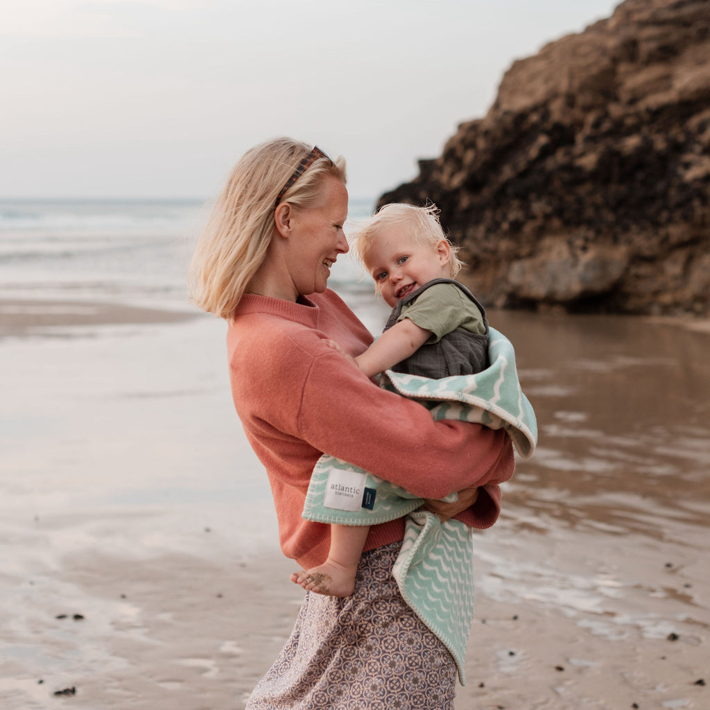 Our beautiful seafoam swell blanket is now available as a baby blanket – not too big, not too small, but just right for your little one. Made from super-soft recycled cotton, this swell blanket makes a promise to be as kind to your baby’s skin as it is the planet. Made in England and inspired by the Cornish coastline, its seafoam swell design is timelessly classic and perfect for every little water-baby – be it at home, on the road or on holiday by the sea.