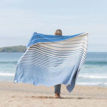Wrap yourself in the rhythm of the coast. The Blue Swell Blanket captures the ebb and flow of the ocean, woven in soft cream and sea-blue waves that echo the tide along the Cornish shore. Crafted from recycled cotton, perfect for beach days, sofa moments, and everything in between.