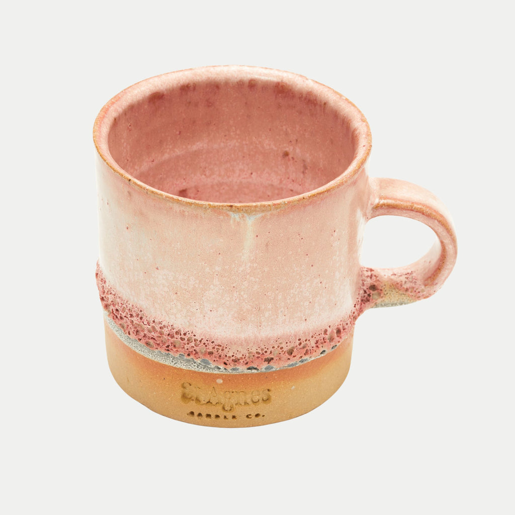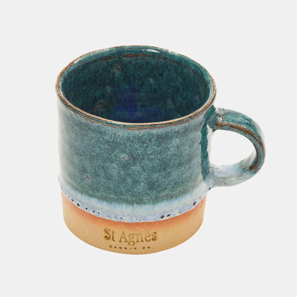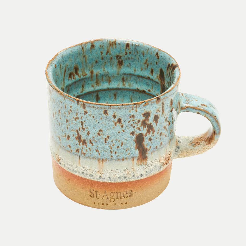 A handcrafted Cornish mug with a unique seafoam-inspired glaze.