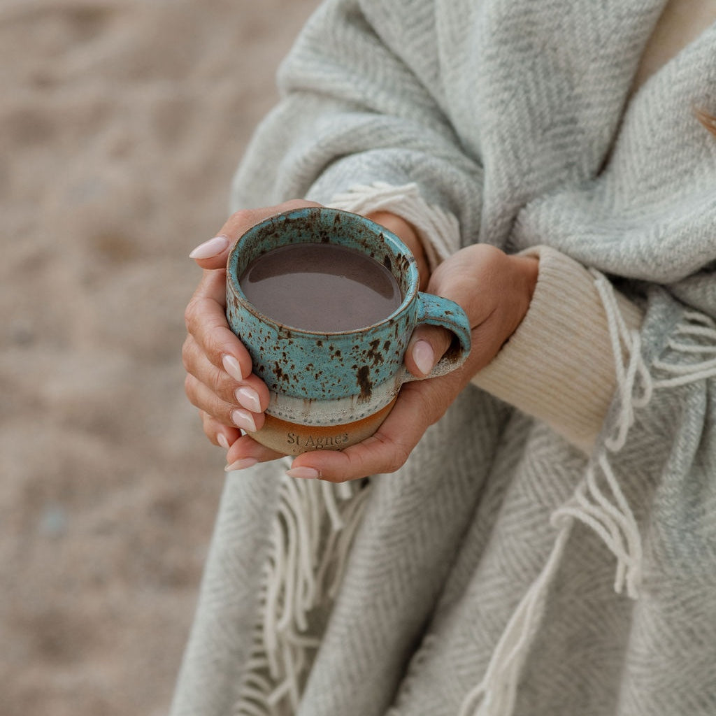 Hand-thrown in Cornwall, each mug features a unique shoreline glaze inspired by seafoam meeting the sand. With its textured finish and one-of-a-kind pattern, no two are ever the same - the perfect mug for slow, coastal moments and comforting cuppas under a blanket.