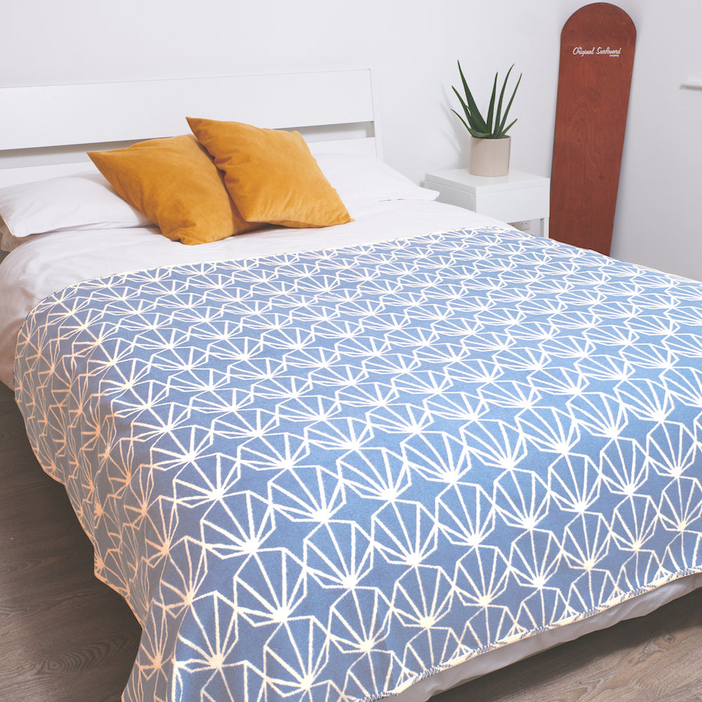 Our beautiful blue shell recycled cotton blanket is a real head-turner with a reversible geometric, seaside-inspired design. Liven up your bedroom and spread it across your bed, leave a spare in the car for long journeys south and take it with you on adventures near and far. Boasting high quality recycled materials, easy care and a smooth, snuggle-inducing touch, it is ideal for every situation.
