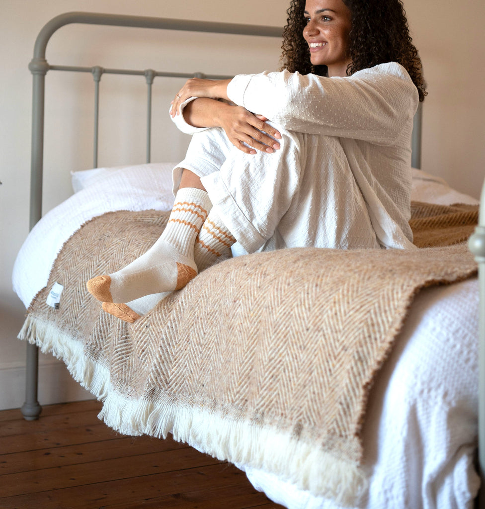 Woven from 100% recycled carpet yarn, the Respun Chevron Blanket brings new life to beautifully made wool. Its heavy weight and tactile texture make it the perfect layer for draping over your bed, wrapping up around the fire, or adding a touch of rugged coastal comfort to your home. Each blanket tells a story of renewal - crafted from redundant yarns, rewoven into something made to last.