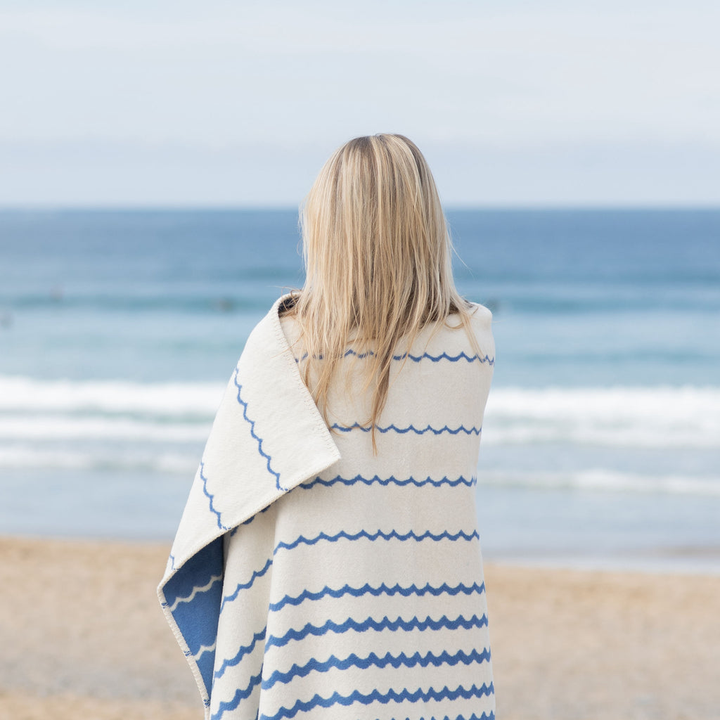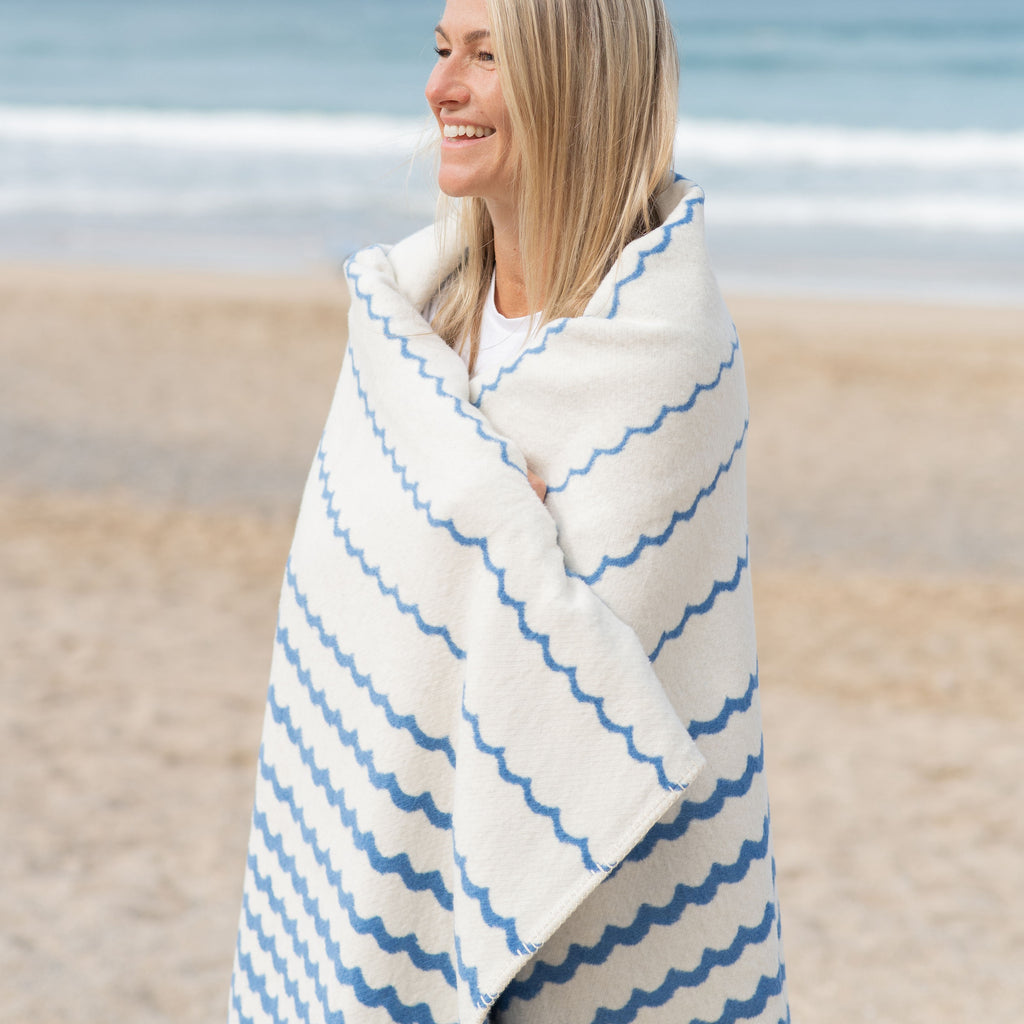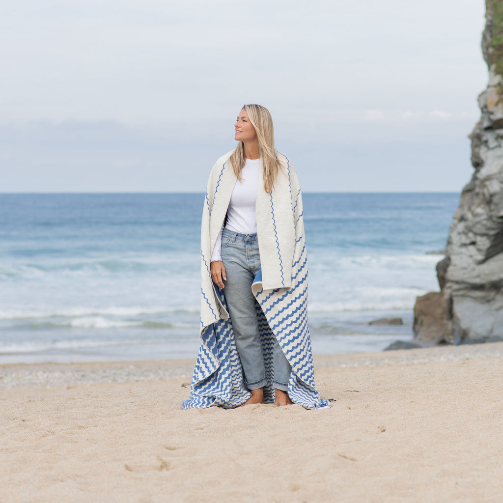 Wrap yourself in the rhythm of the coast. The Blue Swell Blanket captures the ebb and flow of the ocean, woven in soft cream and sea-blue waves that echo the tide along the Cornish shore. Crafted from recycled cotton, perfect for beach days, sofa moments, and everything in between.