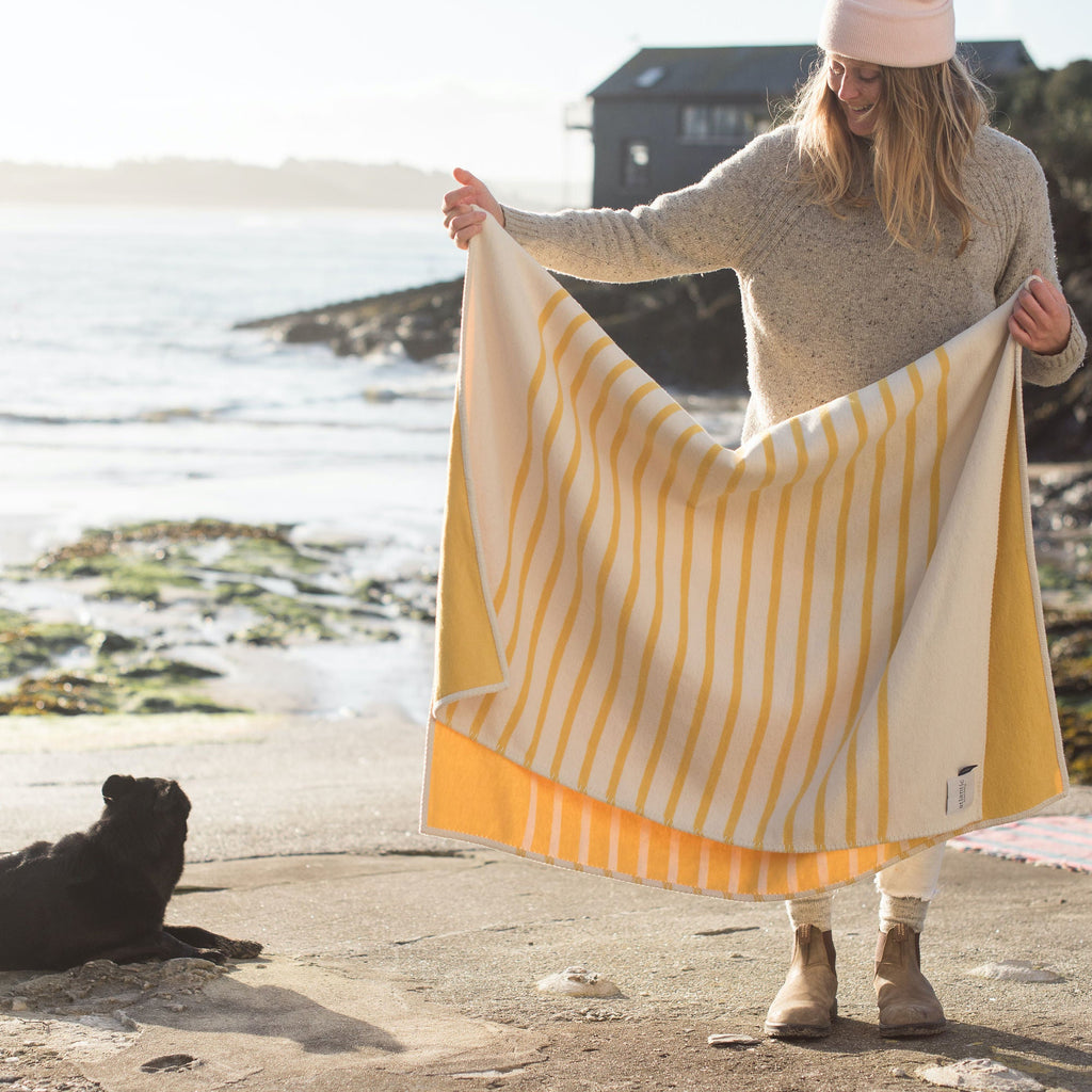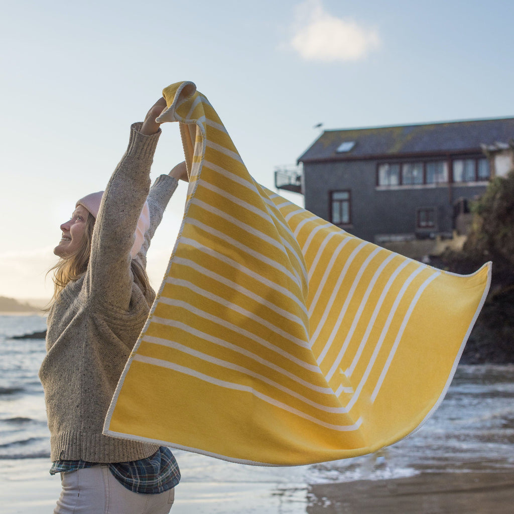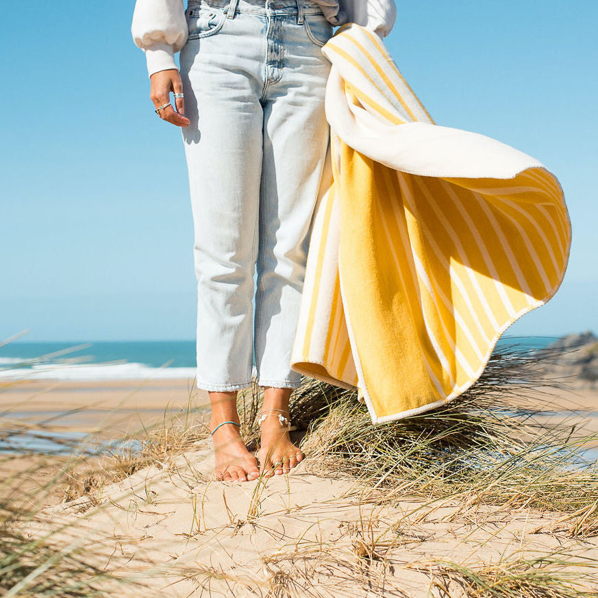 100% recycled, our jaunty yellow stripe recycled cotton blanket nods to the nautical with classic coastal tones and design. Whether it’s pulled around your shoulders for sunset G&Ts on the terrace or nestled between you and the sand as you doze beneath the sunshine, this blanket is everything you could want and more. Providing protection, warmth and comfort, it will quickly become a go-to favourite for all the family.