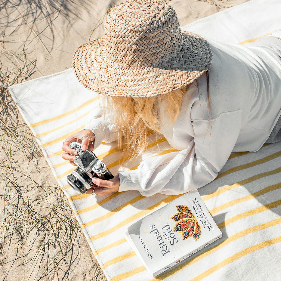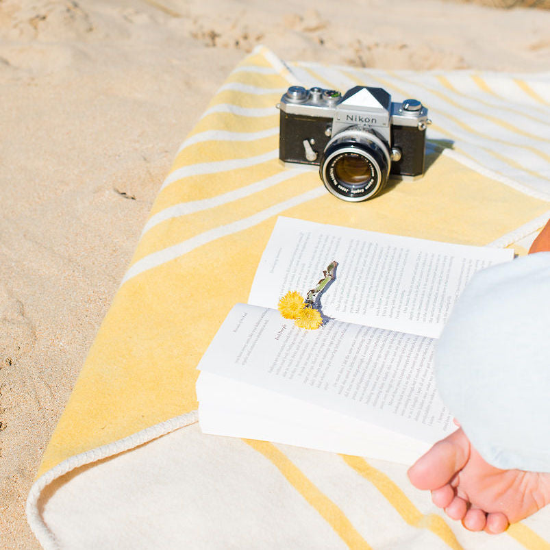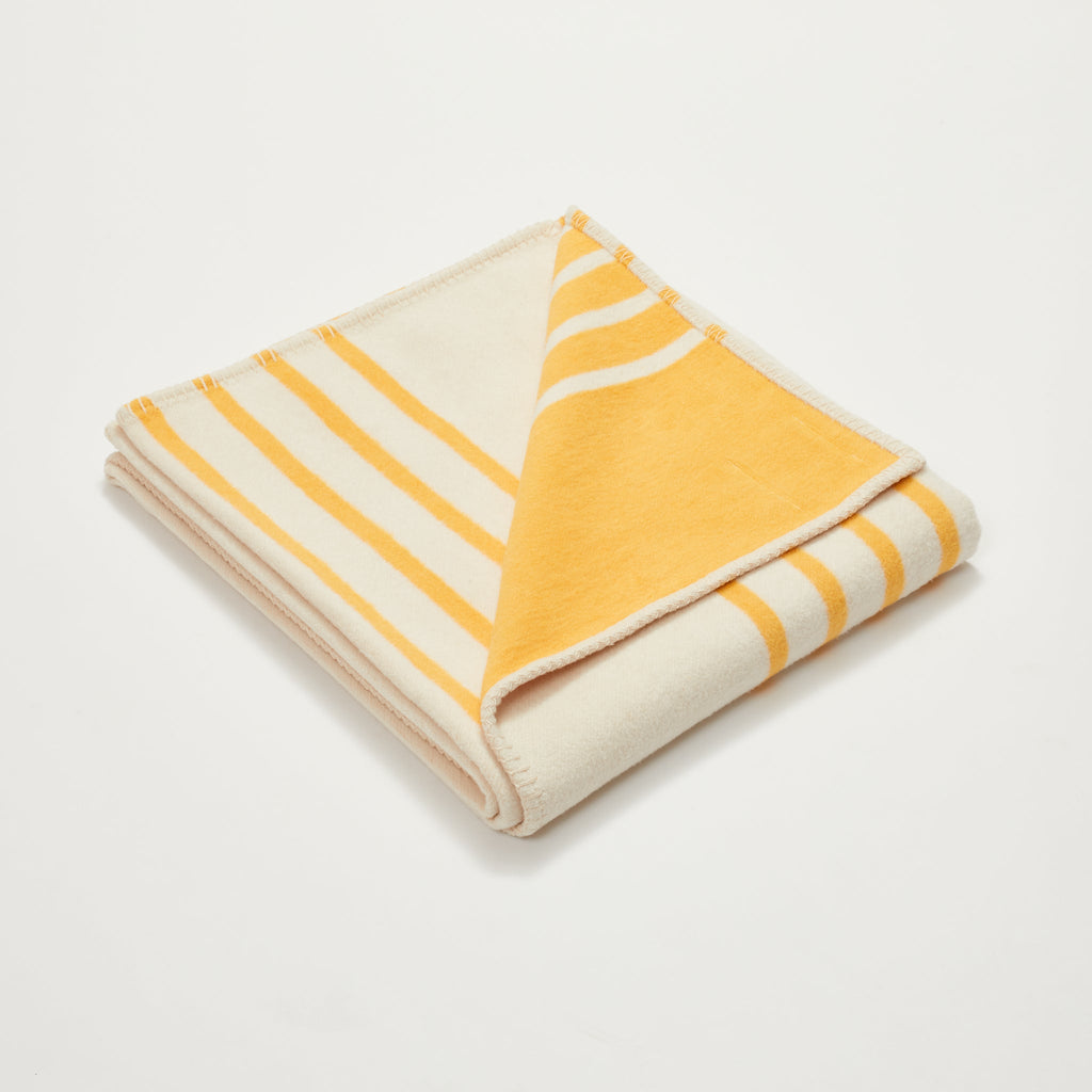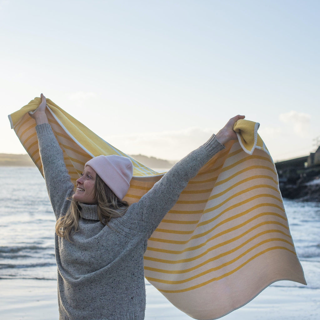 100% recycled, our jaunty yellow stripe recycled cotton blanket nods to the nautical with classic coastal tones and design. Whether it’s pulled around your shoulders for sunset G&Ts on the terrace or nestled between you and the sand as you doze beneath the sunshine, this blanket is everything you could want and more. Providing protection, warmth and comfort, it will quickly become a go-to favourite for all the family.
