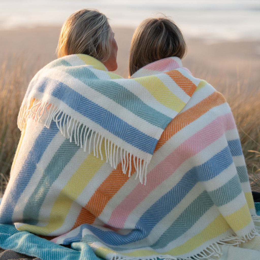 Experience the cosy comfort of a classic English wool blanket, updated with vibrant coastal candy stripes. Cuddle up in the soft, wool fabric and be enveloped in warmth and style. Enjoy the perfect balance of style and comfort.