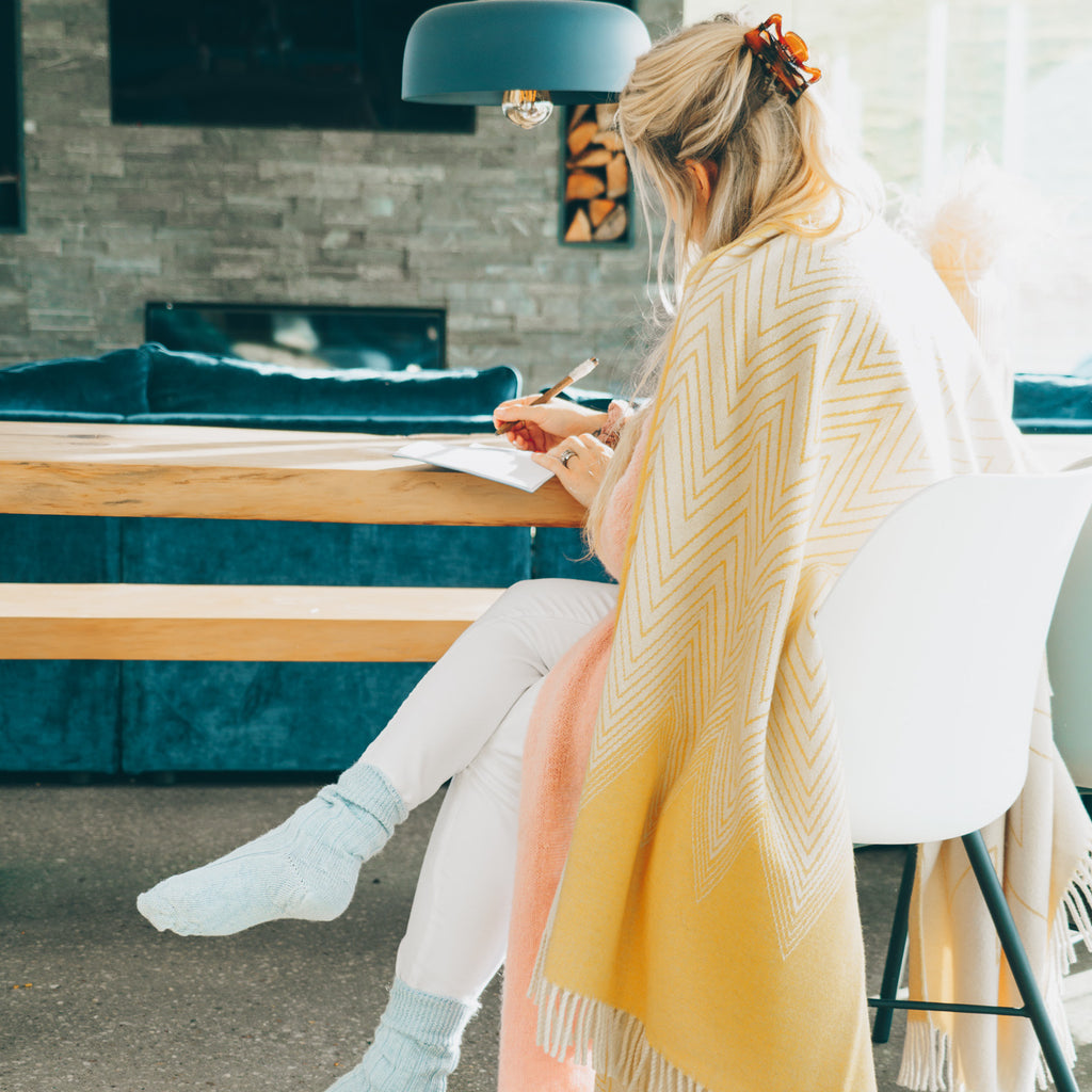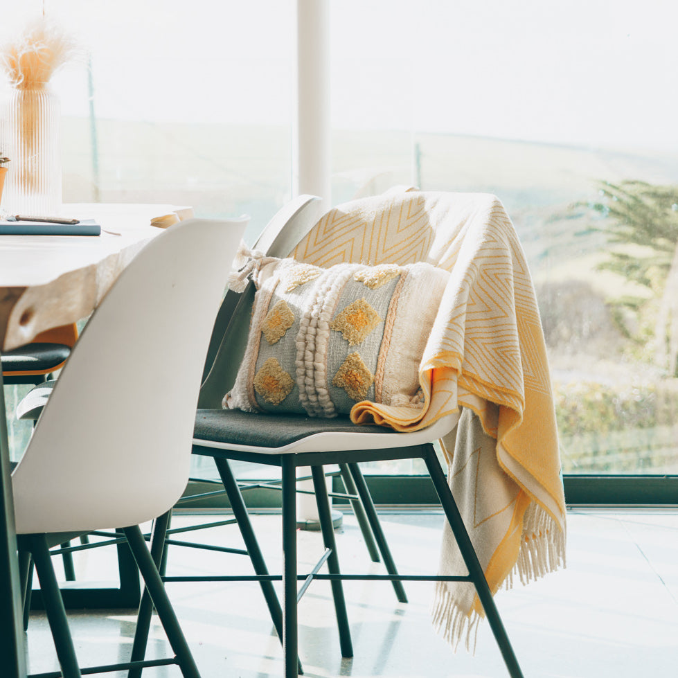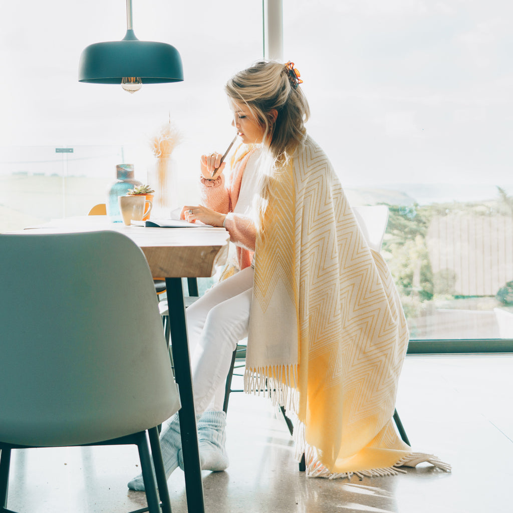A striking number from our new recycled wool range, our snuggle-worthy yellow chevron reversible blanket adds a splash of sunshine wherever you go. With a come-hither appeal, its heavy folds envelope the shoulders to make drawn-out summer evenings by the shore and wintry nights wrapped up by the fire even more sumptuous. Made from recycled materials, this timeless piece champions a sustainable future without compromising an ounce of quality.
